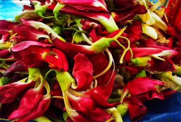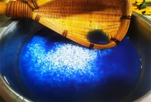 糯米的染色過程并沒有你想象的那么神秘和復(fù)雜,而色彩的秘密就藏在花朵之中。制作染液,只需將染色花在水里煮沸之后撈出花朵的殘?jiān)?,冷卻一段時(shí)間后便大功告成了。密蒙花能制作出明朗黃的染液,蝶豆花能制作出藍(lán)色染液,蘇木能制作出橙色的染液,洛神花能制作出紫色的染液,還有少見的綠色染液,也是利用黃梔子和蝶豆花一起煮沸所制成。當(dāng)染液準(zhǔn)備完成后,只需將糯米分別放入冷卻后的汁液里浸泡十余個(gè)小時(shí),過濾之后蒸一下就可以變成七彩糯米了。